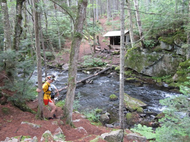 The next 15 mile leg would take us over 7 hours to complete and it would be daylight before we saw our support again. Here, we traversed the Chairback-Barren range on some of the the most rugged terrain I've ever tried to "run". The trail seemed to meander around in search of every bump on the ridge, while never really making any substantial forward progress. When the trail wasn't going up rocky, rooty ledges, it went through shoe sucking mud. To add to all this, we were both feeling the effects of sleep deprivation. While waiting for Ryan to take care of some issues, I shut off my lights to look up at the stars. For a moment I forgot how grueling things were and felt a profound appreciation for what were doing. It was a warm summer night, the weather was clear, the stars were out, and... I dozed off on my feet. Eventually the sun came up as we were making our way down the mountain to our fifth and final check point, Long Pond Stream (mile 85) at about 6:30 am.